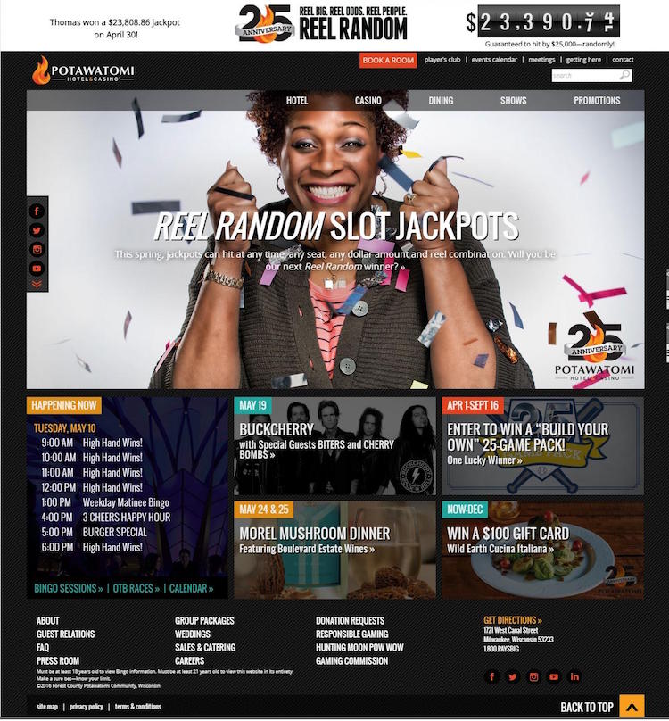Located at 1721 West Canal Street, Milwaukee, WI, Potawatomi Hotel Casino is the Midwest’s number one entertainment destination. With nearly 100 table games, 3,100 slot machines, 1,350-seat Bingo Hall, Poker Room and Off-Track Betting Room, and a 381 room hotel, the Casino offers thrilling action 24 hours a day, 7 days a week.